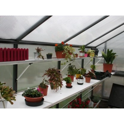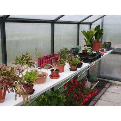 Das praktische KGT Tischgestell ist aus hochwertigem Aluminium gefertigt und sorgt für Ordnung im Gewächshaus. Es eignet sich z. B. zum Ein- und Umtopfen, zur Aussaat und für Arbeiten rund um die Pflanzenpflege. Es verläuft über die gesamte Seitenwand des Gewächshauses. Die hochbruchfesten weißen Kunststoff-Einlegeplatten sind individuell herausnehmbar und leicht zu reinigen. Dank der intelligenten Befestigung am Gewächshaus sind alle tragenden Einrichtungsteile hoch belastbar. Die Tiefe des Tischgestells beträgt ca. 63,5 cm.