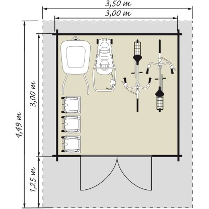 Das Kiehn-Holz Holz-Gartenhaus ist geräumig gestaltet mit einer Grundfläche von 9 m². Es bietet eine Durchgangsbreite von 170 cm und eine Durchgangshöhe von 145 cm. Der breite Eingang ermöglicht einen einfachen Zugang des Holz-Gartenhauses, auch mit größeren Geräten, Gartenutensilien, Fahrrädern und Gartenmöbeln. Die Firsthöhe beträgt 250 cm, wodurch eine angenehme Kopffreiheit im Innenraum gegeben ist. Der Boden ist bereits im Lieferumfang enthalten.