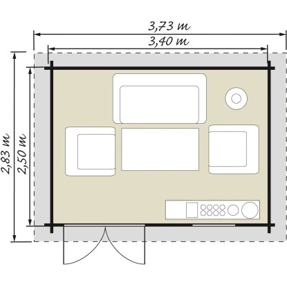 Das Kiehn-Holz Holz-Gartenhaus ist platzsparend gestaltet mit einer Grundfläche von 8,5 m². Es bietet eine Durchgangsbreite von 170 cm und eine Durchgangshöhe von 143 cm. Der breite Eingang ermöglicht ein einfaches Betreten des Holz-Gartenhauses, auch mit größeren Geräten, Gartenutensilien, Fahrrädern und Gartenmöbeln. Die Firsthöhe beträgt 231 cm, wodurch eine angenehme Kopffreiheit im Innenraum gegeben ist. Der Boden ist bereits im Lieferumfang enthalten.