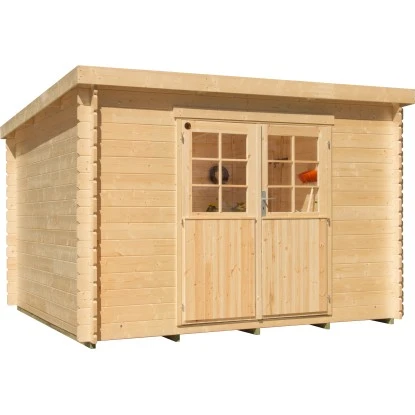 Das Gartenhaus ist aus unbehandeltem Holz in Blockbohlenbauweise gefertigt. Durch die naturbelassene Oberfläche bleibt eine natürliche Optik mit Holzmaserung erhalten. Zum Schutz vor Witterungseinflüssen sollte die Oberfläche individuell mit einer Lackierung oder Lasierung veredelt werden. Das Gartenhaus verfügt über eine stabile Konstruktion, mit einer Wandstärke von 28 mm. Die maximalen Schneelast des Flachdachs liegt bei 85 kg/m. Die Dacheindeckung ist separat erhältlich. Aufgrund der speziellen Dachform eignen sich hochwertige Dachbahnen besonders gut als Dacheindeckung.