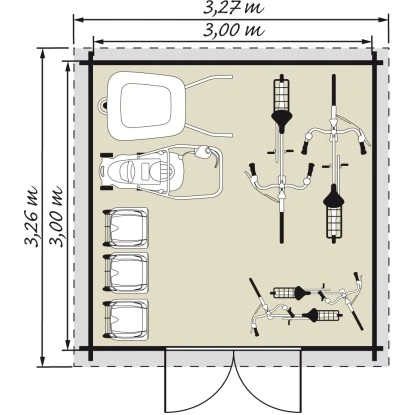 Das Kiehn-Holz Gartenhaus aus Holz ist großzügig gestaltet mit einer Grundfläche von 9 m². Es bietet eine Durchgangsbreite von 170 cm und eine Durchgangshöhe von 150 cm. Der breite Eingang ermöglicht einen einfachen Zugang des Holz-Gartenhauses, auch mit größeren Geräten, Gartenutensilien, Fahrrädern und Gartenmöbeln. Die Firsthöhe beträgt 222 cm, wodurch eine angenehme Kopffreiheit im Innenraum gegeben ist. Der Boden ist bereits im Lieferumfang enthalten.