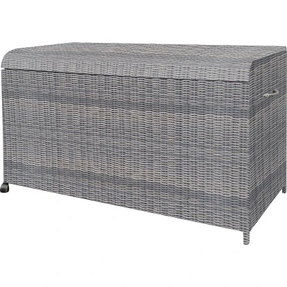 Die Kissenbox aus der vielseitigen Serie Vermont eignet sich optimal für die Aufbewahrung von Kissen, Auflagen und anderen Gartenutensilien. Sie können in ihr auch beispielsweise Gartengeräte, Grillzubehör oder Gartenspielzeug unterbringen. Die Gartentruhe besitzt ein leichtes, aber stabiles Aluminiumgestell und ist mit einem attraktiven Polyrattan-Geflecht in der Farbe Wave überzogen.