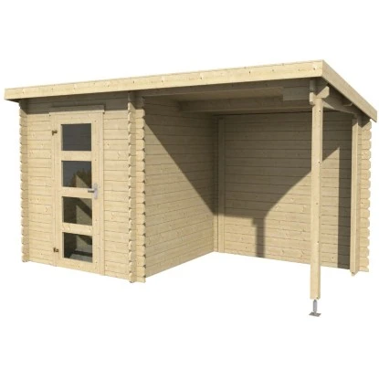 Das Gartenhaus ist in Blockbohlenbauweise aus unbehandeltem Holz gefertigt. Durch die naturbelassene Oberfläche bleibt eine natürliche Optik mit Holzmaserung erhalten. Zum Schutz vor Witterungseinflüssen sollte die Oberfläche individuell mit einer Lackierung oder Lasierung veredelt werden. Das Gerätehaus verfügt über eine stabile Konstruktion, mit einer Wandstärke von 28 mm. Die maximalen Schneelast des Flachdachs liegt bei 122 kg/m. Die Dacheindeckung in Form von Dachpappe ist bereits im Lieferumfang enthalten. Aufgrund der speziellen Dachform eignen sich hochwertige Dachbahnen besonders gut als Dacheindeckung.