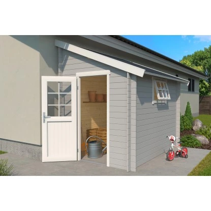 Das Holz-Gartenhaus überzeugt durch sein klassisches Design und ist dabei in der Farbe Lichtgrau gehalten. Es eignet sich für den universellen Einsatz als Geräteschuppen, Gartenpavillon oder Freizeithaus.