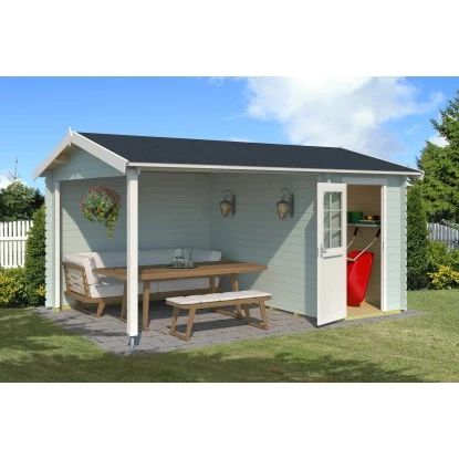 Das Gartenhaus aus Holz überzeugt durch sein klassisches Design und ist dabei in der Farbe Gletschergrün gehalten. Es eignet sich für den universellen Einsatz als Geräteschuppen, Gartenpavillon oder Freizeithaus.