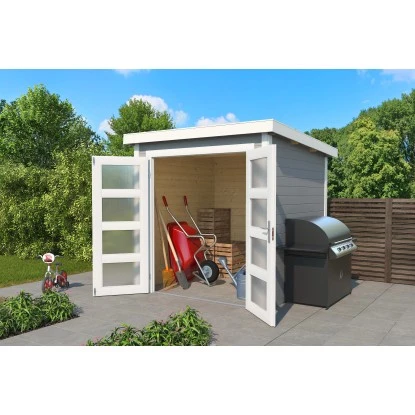 Das Holz-Gartenhaus überzeugt durch sein modernes Design und ist dabei in schlichtem Lichtgrau gehalten. Es eignet sich für den universellen Einsatz als Geräteschuppen, Gartenpavillon oder Freizeithaus.