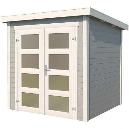 Das Holz-Gartenhaus überzeugt durch sein modernes Design und ist dabei in schlichtem Lichtgrau gehalten. Es eignet sich für den universellen Einsatz als Geräteschuppen, Gartenpavillon oder Freizeithaus.
