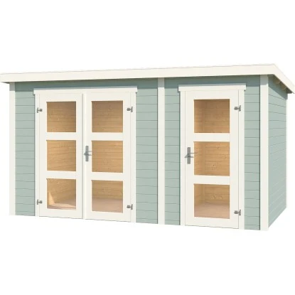 Das Gartenhaus überzeugt durch sein modernes Design und ist dabei in schlichtem Gletschergrün gehalten. Es eignet sich für den universellen Einsatz als Geräteschuppen, Gartenpavillon oder Freizeithaus.