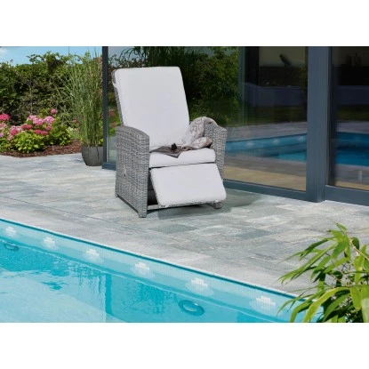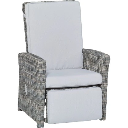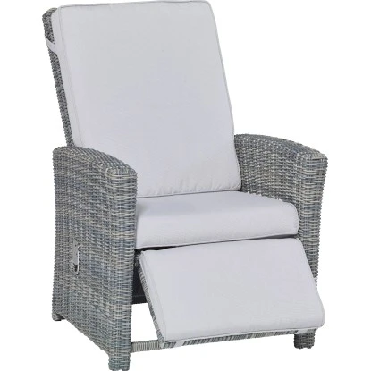 Die Rückenlehne des Sessels lässt sich stufenlos auf die für Sie optimale Sitz- oder Liegeposition einstellen. Über eine integrierte Gasfeder lässt sich die Fußstütze ein- und ausfahren. Sie gibt Ihrer Beinpartie angenehmen Halt. Durch das leichte, aber sehr stabile Aluminiumgestell, das gerade einmal 15 kg wiegt, können Sie den Sessel ohne viel Mühe an den gewünschten Ort bewegen. Es ist mit attraktivem, handgeflochtenen Polyrattan in der Farbe Wave umspannt. Das Material ist pflegeleicht und wetterbeständig. Die bequemen Auflagen und Kissen in der Farbe Cliff sind gleich mit enthalten. Die Bezüge bestehen aus 100 % Polyester. Das Sitzkissen hat eine Schaumstofffüllung , die 8 cm stark ist. Das Rückenkissen ist mit 6 cm dickem gesponnenem Polyester gefüllt und die Füllung des Auslegerkissens ist 4 cm hoher Schaumstoff.