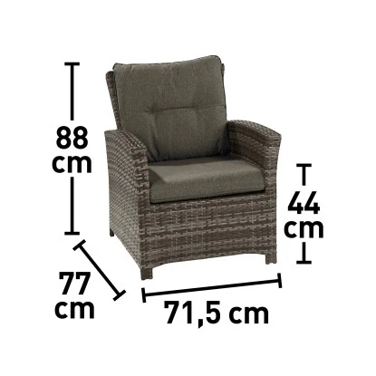 Dank des leichten, aber sehr stabilen Aluminiumgestells können Sie den Sessel ohne viel Mühe an den von Ihnen gewünschten Ort bewegen. Sein handgeflochtenes Polyrattan-Geflecht in der Farbe Shadow ist wetterfest und pflegeleicht. Für einen hohen Sitzkomfort sorgen die bequeme Auflage und ein Kissen. Die Bezüge bestehen aus 100 % Polyester in der Farbe Earth. Das Sitzkissen aus Schaumstoff hat eine Stärke von 10 cm, während das Rückenkissen über eine Füllung aus 6 cm starkem, gesponnenem Polyester verfügt. Der Sessel hat die Maße 88 cm x 77 cm x 71,5 cm (H x B x T) und lässt sich ideal mit anderen Möbelstücken aus der Serie Vermont kombinieren.