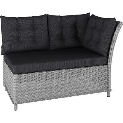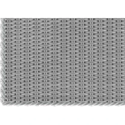 Die Loungemöbel bestehen aus handgeflochtenem Polyrattan, wodurch jedes Teil ein Unikat darstellt. Die weiß-graue Flechtoptik strahlt ein sommerliches Flair aus. Zudem verfügt das Material über eine pflegeleichte Oberfläche und ist witterungsbeständig. Das Alugestell sorgt dabei für Stabilität und Belastbarkeit. Sein Gewicht ist gering und das Umstellen der Möbel kann ganz mühelos erfolgen. Es gehören insgesamt acht Rückenkissen und drei Sitzkissen mit zur Ausstattung. Sie bilden mit ihrer dunkelgrauen Optik einen ansprechenden Farbkontrast zur Sitzgruppe und runden das elegante Bild ab. Ihre Dicke beträgt 10 cm, damit Sie besonders weich sitzen können. Die formbeständigen Sitzkissen sind mit 100 % Schaumstoff gefüllt und die bequem-weichen Rückenkissen mit 100 % Polypropylen-Baumwolle. Die Bezüge bestehen aus 100 % Polyspun, einem modernen, strapazierfähigen Gewebe.