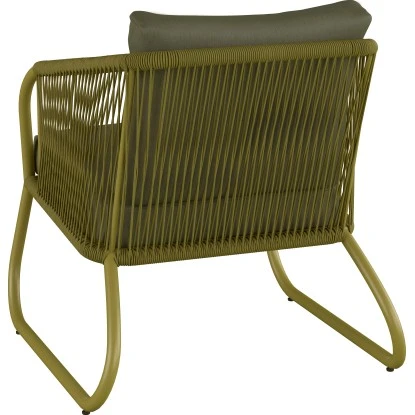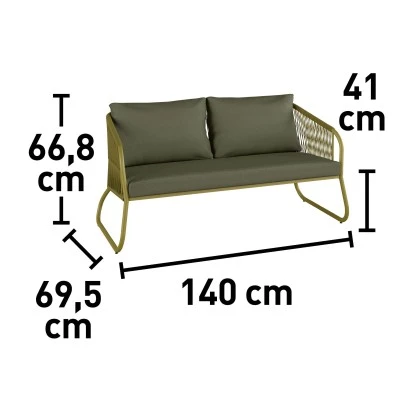 Qualitativ bestechen die Loungemöbel durch ein wetterfestes und leichtes Gestell aus Aluminium. Ausgestattet sind sie zudem mit einer pflegeleichten Seilbespannung aus Polyester. Mit seinem modernen Design in der Farbe Oliv ist das Lounge-Set ein Hingucker in Ihrem Außenbereich. Um Ihnen einen angenehmen Sitzkomfort zu ermöglichen, verfügen die Sessel und das Sofa über gepolsterte Sitz- und Rückenkissen aus Polyester. Im Einzelnen besteht die Gartenmöbel-Gruppe aus einem Gartensofa der Größe 66,8 cm x 140 cm x 69,5 cm (H x B x T), zwei Sesseln mit den Maßen 66,8 cm x 65,7 cm x 69,5 cm (H x B x T) und einem Tisch von 36 cm x 100 cm x 53 cm (H x B x T).