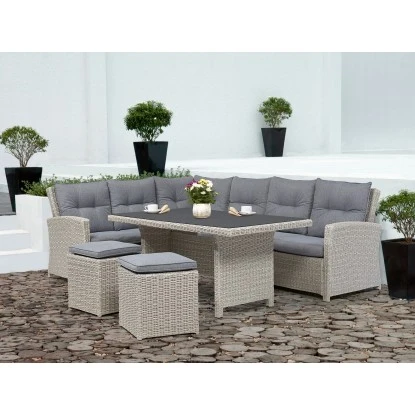 Das 5-teilige Lounge-Set mit Esstisch der Serie Vermont mit einer Eckbank links lädt zum Relaxen und gemütlichen Beisammensitzen ein. Die Gartenmöbelgruppe besticht durch ihr hochwertiges Material, ihren extra Komfort und ihr stilvolles Design. Dank der cleveren Kombination aus Lounge- und Esstisch-Gruppe eignet sie sich sowohl zum entspannten Verweilen in Ihrem Garten als auch für einen gemeinsamen Grillabend in größerer Runde. Denn Sitzbänke besitzen die praktische Eigenschaft, viel Sitzfläche mit wenig Möbeln zu bieten. Die beiden handlichen Hocker sind flexibel arrangierbar. An dieser Rattangarnitur können bis zu sieben Personen Platz finden. Auch können Sie einen weiteren Gartensessel der Serie Vermont ergänzen (nicht im Lieferumfang enthalten). Zudem verfügt der Tisch über eine angenehme Höhe und ist mit einer pflegeleichten Glasplatte in Grau ausgestattet.