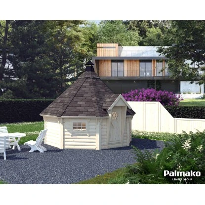 Die Palmako Grillkota Eva 11,4 m² lädt dazu ein, die Grillsaison bis in den Winter zu verlängern. Die achteckige Grillhütte mit 44 mm Bohlen aus unbehandeltem, nordischem Fichtenholz ist ein Garant für gemütliche Grillabende in fröhlicher Runde unabhängig von der Jahreszeit. Das Dach der 8-Eck Grillkota besteht aus vorgefertigten Elementen. Mit einem einfachen Steck- und Schraubsystem kann sie unkompliziert zusammengebaut werden. Die Fenster lassen sich nach außen aufklappen und sind aus ISO-Glas mit aufgesetzten Sprossen. Der Fußboden ist im Lieferumfang enthalten. Dacheindeckung und Grillofen sind optional erhältlich. Versehen Sie das Haus nach dem Aufbau mit einer Grundierung und einem Anstrich zum Schutz gegen Witterungseinflüsse.