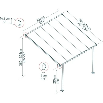 Genießen Sie den Außenbereich mit der Feria-Terrassenüberdachung. Die Feria ist eine ästhetische, wartungsfreie Überdachungslösung, die verschiedene Verwendungsmöglichkeiten im Freien bietet, z. B. als Terrassenüberdachung, Sonnenlounge usw. Schützen Sie Ihre Gegenstände vor rauen Wetterbedingungen und schädlichen UV-Strahlen mit dieser leistungsstarken Struktur. Sie verfügt über flexible Pfosten, mit denen Sie die gewünschte Wandanschlusshöhe, den Abstand zum Haus und den Abstand zwischen den Pfosten an der Vorderseite einstellen können. Das Terrassendach wurde so konzipiert, dass es von 2 Personen einfach zusammengebaut werden kann. Dabei wird das Click-N-Lock- Dachsystem für eine sichere und einfache Montage verwendet. Es erfordert keine Erfahrung, keine besonderen Fähigkeiten und kein Spezialwerkzeug. Die Feria Terrassenmarkise bietet Ihrer Familie eine elegante, hochwertig verarbeitete, robuste Ergänzung zu Ihrem Außenwohnraum, die für viele Jahre stabil und rostfrei ist.