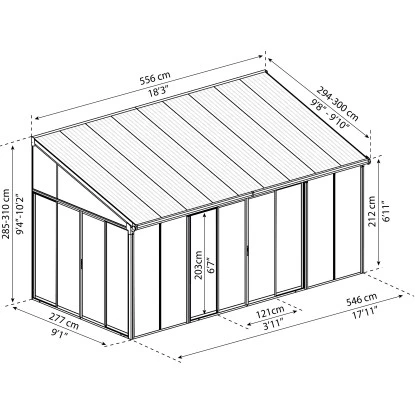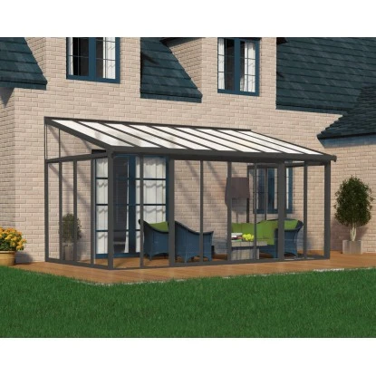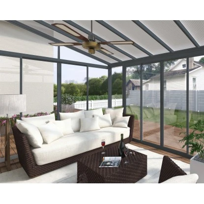 Der Palram – Canopia Wintergarten San Remo überzeugt durch sein modernes Design. Die massive Konstruktion aus einbrennlackiertem Aluminium und galvanisierten Stahlverbindungen, sorgt für enorme Stabilität.