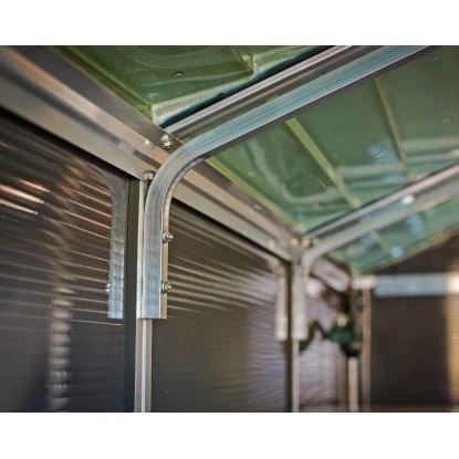 Das Gerätehaus verfügt über eine stabile Konstruktion, mit einer Wandstärke von 10 mm. Die maximalen Schneelast des Spitzdach liegt bei 90 kg/m. Die Firsthöhe beträgt 217 cm, wodurch eine angenehme Kopffreiheit im Innenraum gegeben ist. Die Oberfläche des Metall-Gerätehauses ist unbehandelt, um es optimal vor Witterungseinflüssen zu schützen und Korrosion vorzubeugen.