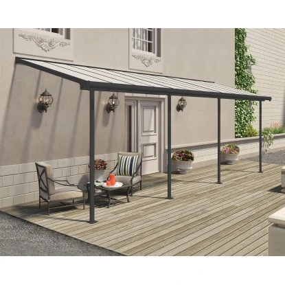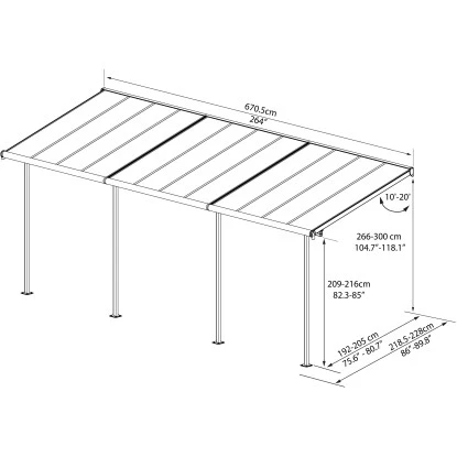 Das Palram Terrassendach Sierra kommt in ganz neuartigem Design. Es ist extrem stabil dank der massiven Konstruktion aus einbrennlackiertem Aluminium und galvanisierten Stahlverbindungen. Nie wieder streichen, kein Rost, kein Verwittern. Trägt Schneelasten bis zu 125 kg/ m²! Die 6 mm starken, 100 %-UV beständigen Hohlkammerplatten sorgen für hohen Lichteinfall und angenehme Sitzatmosphäre. Durch die wählbare Anbringung der Höhe von 266 cm – 300 cm sowie den flexiblen Außenpfosten ist die Überdachung variabel anbringbar und passt sich allen Gegebenheiten an.