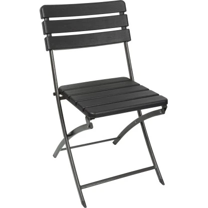 Dieser schwarze Klappstuhl in Holzoptik ist ideal für den Innen- und Außenbereich. Der Sitz aus Polyethylen ist widerstandsfähig gegen Stöße, Risse, Abplatzungen und Flecken. Der wetterfeste Stahlrahmen sorgt für gute Stabilität.