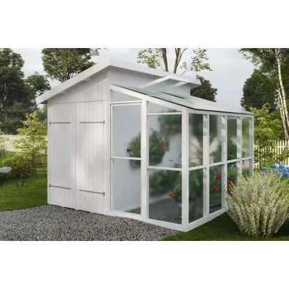 Das Polhus Gewächshaus Ernst mit den Abmessungen 276 cm x 284 cm kombiniert Gerätehaus und Gewächshaus und bietet viel Platz für Stauraum.