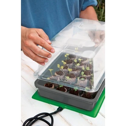 Dank der Heizmatte erfolgt eine konstante Wärmeabgabe, während das Beleuchtungssystem eine Anzucht unabhängig vom Tageslicht und den Jahreszeiten macht. Die integrierten Belüftungsklappen regulieren die Feuchtigkeit.