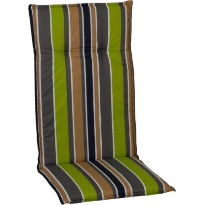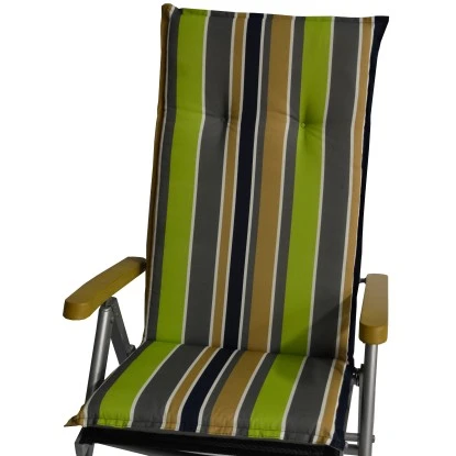Saumauflage für Hochlehner Gartenstühle mit den Maßen 118 cm x 50 cm und einer Polsterstärke von 6 cm. Die Auflage hat eine Schaumstoff- und Vliesfüllung. Der Stoff besteht aus 50% Baumwolle und 50% Polyester. Er ist schadstoffrei.