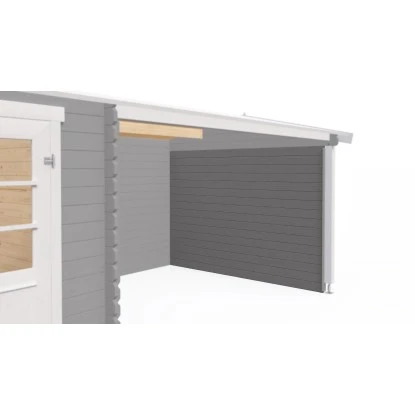 Die 28 mm starke Seitenwand für den Anbau aus massiven Blockbohlen ist geeignet für die Flachdachhäuser wie Tampa, St. Louis, Novia Plus und Jelle Plus.