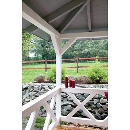 Die dekorative Skan Holz Brüstung mit massiven Andreaskreuzen aus Konstruktionsvollholz eignet sich für Skan Holz Pavillons aus Leimholz mit einem Pfostenabstand von 465 cm.