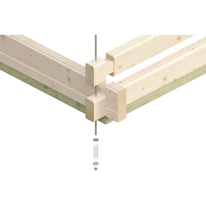 Das Gartenhaus ist in Blockbohlenbauweise aus unbehandeltem Holz gefertigt. Durch die naturbelassene Oberfläche bleibt eine natürliche Optik mit Holzmaserung erhalten. Zum Schutz vor Witterungseinflüssen sollte die Oberfläche individuell mit einer Lackierung oder Lasierung veredelt werden. Das Holz-Gartenhaus verfügt über eine stabile Konstruktion, mit einer Wandstärke von 70 mm. Die maximalen Schneelast des Satteldachs liegt bei 175 kg/m. Die Dacheindeckung ist separat erhältlich.