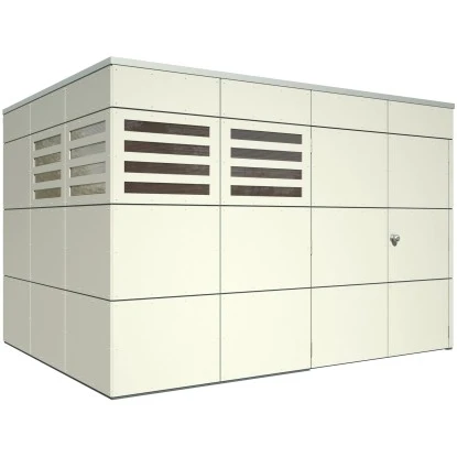 Das Gartenhaus ist in Elementbauweise aus lackiertem Holz gefertigt. Die Lackierung schützt das Haus vor Witterungseinflüssen und verleiht dem Gartenhaus eine langlebige ansprechende Optik. Das Holz-Gartenhaus verfügt über eine robuste Konstruktion. Die maximalen Schneelast des Flachdachs liegt bei 85 kg/m. Aufgrund der speziellen Dachform eignen sich hochwertige Dachbahnen besonders gut als Dacheindeckung.