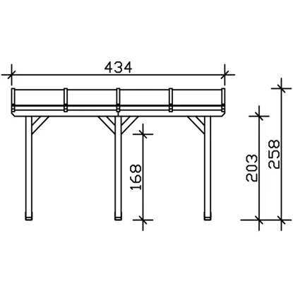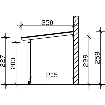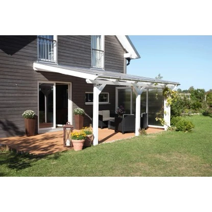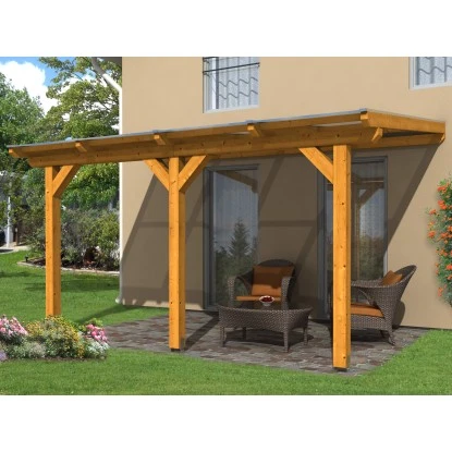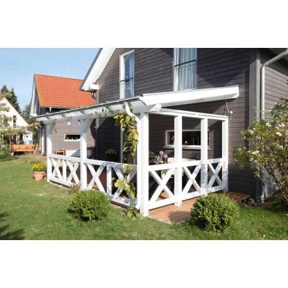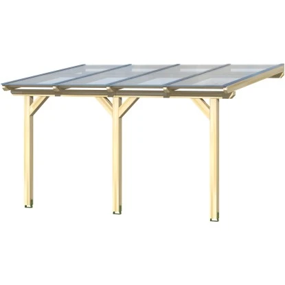 Die hochwertige Skan Holz Terrassenüberdachung Andria ist aus Leimholz (BSH Fichte) gefertigt. Die Konstruktion hat Mittelpfosten und gerade Kopfbänder. Pfosten 12 x 12 cm inkl. Aufschraubstützen. Dacheindeckung aus 16 mm Polycarbonat Doppelstegplatten in klar. Lieferung inkl. Montagematerial (ohne Wandbefestigungsmaterial) und Aufbauanleitung.