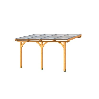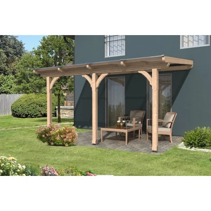 Die hochwertige Skan Holz Terrassenüberdachung Rimini ist aus Douglasie gefertigt. Stabile Konstruktion mit Mittelpfosten und Kopfbändern. Pfosten 12 x 12 cm inkl. Aufschraubstützen. Optisch ansprechend durch die gefasten Pfosten, die verzierten Sparren- und Pfettenenden sowie die geschwungenen Kopfbänder. Dacheindeckung aus 16 mm Polycarbonat Doppelstegplatten in klar. Lieferung inkl. Montagematerial (ohne Wandbefestigungsmaterial) und Aufbauanleitung.