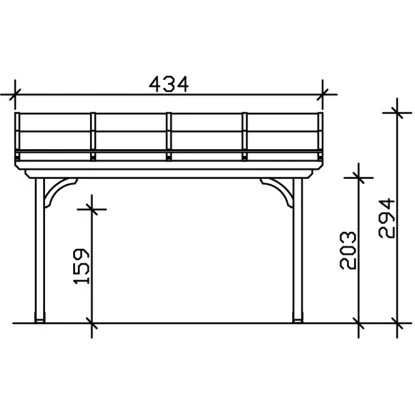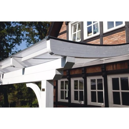 Die hochwertige Skan Holz Terrassenüberdachung Verona ohne Mittelpfosten ist aus Leimholz (BSH Fichte) gefertigt. Die stilvoll geschwungenen Sparren und die runden Kopfbänder machen den Charme dieser Überdachung aus. Pfosten 12 x 12 cm inkl. Aufschraubstützen. Dacheindeckung aus 10 mm Polycarbonat Doppelstegplatten in klar. Lieferung inkl. Aluminium-Schienen, Montagematerial (ohne Wandbefestigungsmaterial) und Aufbauanleitung.