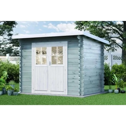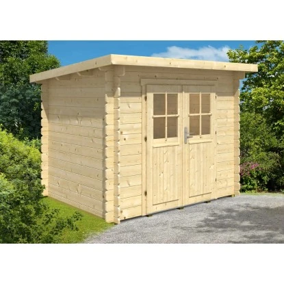 Das Gartenhaus ist in Blockbohlenbauweise aus unbehandeltem Holz gefertigt. Durch die naturbelassene Oberfläche bleibt eine natürliche Optik mit Holzmaserung erhalten. Zum Schutz vor Witterungseinflüssen sollte die Oberfläche individuell mit einer Lackierung oder Lasierung veredelt werden. Das Holz-Gartenhaus verfügt über eine robuste Konstruktion, mit einer Wandstärke von 28 mm. Das Dach des Gerätehauses ist als Pultdach gestaltet. Die Dacheindeckung ist separat erhältlich.