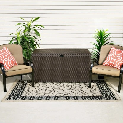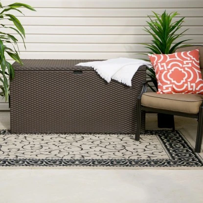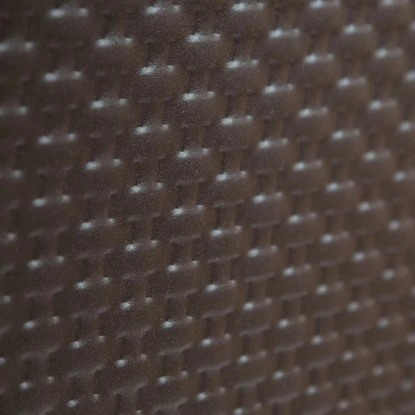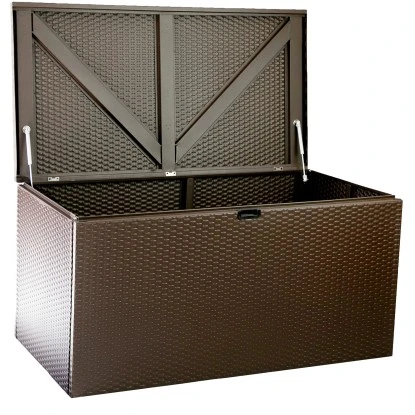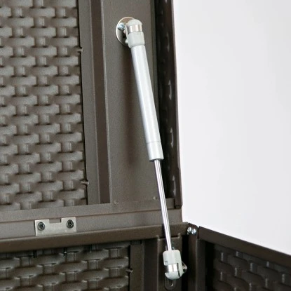 Das Gerätehaus aus Metall überzeugt durch seine ansprechende Optik und ist dabei in schlichtem Braun gehalten.
