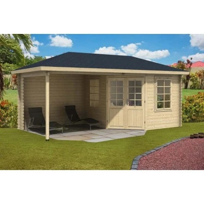 Im Lieferumfang des Gartenhauses sind ein Massivholzfußboden aus 18 mm Nut- und Federbrettern inklusive Fußleisten sowie ein Massivholzdach aus demselben Material enthalten. Alle Blockbohlen des Hauses verfügen über eine 4-fache Eckausfräsung, um eine wind- und regendichte Konstruktion zu gewährleisten.