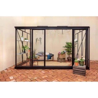 Das Anlehngewächshaus ist mit einer praktischen Schiebetür ausgestattet, die eine Größe von 170 cm x 201 cm hat. So können Sie bequem in das Gewächshaus gelangen und Ihre Pflanzen pflegen, ohne Platzprobleme zu bekommen.