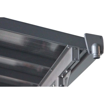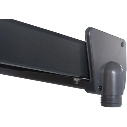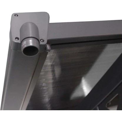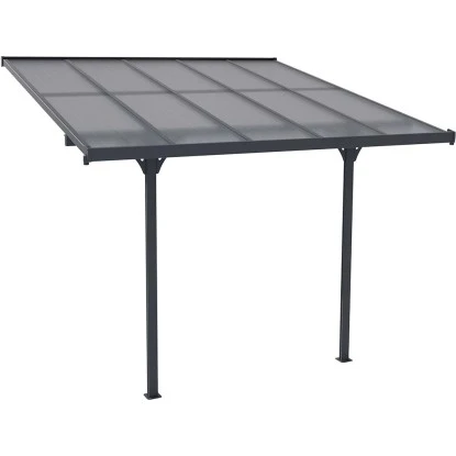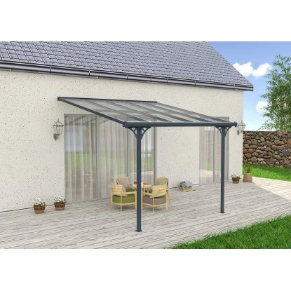 Starke und langlebige Terrassenüberdachung aus hochwertigem pulverbeschichteten Aluminium. Dacheindeckung mit 8 mm starken, hohlen Polycarbonat-Dachplatten. Durch die integrierte Wasserablaufrinne wird eine schnelle Ableitung von Regenwasser ermöglicht. Die zwei Standbalken werden fest am Boden verankert. Dadurch ist die Terrassenüberdachung wetterfest, korrosionsbeständig und langlebig. Das geschmackvolle und funktionale Design sorgt für ein perfektes Umfeld.