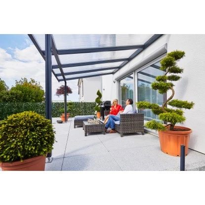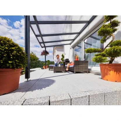 Wind und Wetter können dem Terrassendach nichts anhaben. Das Material ist UV- und hagelbeständig. Selbst hohen Schneelasten hält die Konstruktion mühelos stand. Und für einen schnellen Wasserabtransport sorgt die integrierte Regenrinne mit flexiblem Wasserablauf.