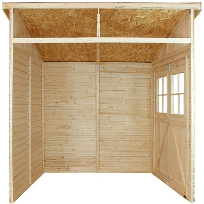 Mit der einfachen Montage und der ineinander greifenden Schuppenverkleidung ist Ihr Hab und Gut vor Witterungseinflüssen geschützt. Kaufen Sie jetzt Ihr Timbela Anbau-Gartenhaus Holz M338 und genießen Sie Ihren Außenbereich mehr denn je.