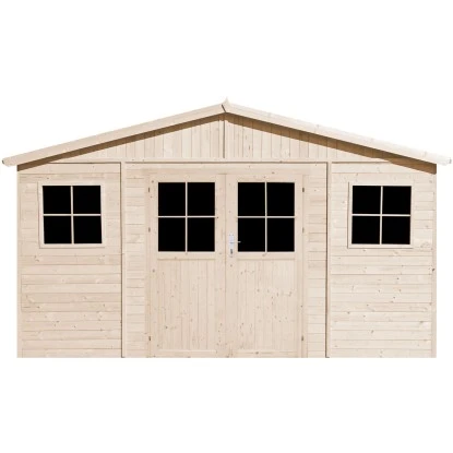Das Gartenhaus ist aus unbehandeltem Holz in Elementbauweise gefertigt. Durch die naturbelassene Oberfläche bleibt eine natürliche Optik mit Holzmaserung erhalten. Zum Schutz vor Witterungseinflüssen sollte die Oberfläche individuell mit einer Lackierung oder Lasierung veredelt werden. Das Gartenhaus verfügt über eine stabile Konstruktion, mit einer Wandstärke von 17 mm. Die maximalen Schneelast des Satteldachs liegt bei 30 kg/m.