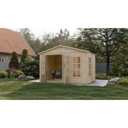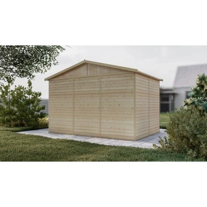 Das Gartenhaus ist aus unbehandeltem Holz in Elementbauweise gefertigt. Durch die naturbelassene Oberfläche bleibt eine natürliche Optik mit Holzmaserung erhalten. Zum Schutz vor Witterungseinflüssen sollte die Oberfläche individuell mit einer Lackierung oder Lasierung veredelt werden. Das Gartenhaus verfügt über eine stabile Konstruktion, mit einer Wandstärke von 17 mm. Die maximalen Schneelast des Satteldachs liegt bei 30 kg/m.