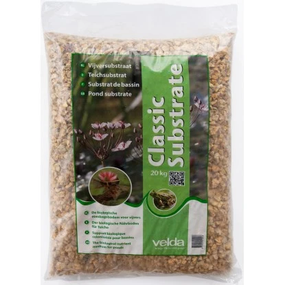 Das Velda Teichboden-Substrat Classic sorgt durch eine offene Struktur und eine große interne Oberfläche für eine optimale Entwicklung von für den Teich wichtigen Bakterien und Mikroorganismen. Das garantiert eine optimale Entwicklung des Teichmilieus. Es enthält alle erforderlichen Mineralstoffe und Spurenelemente. Für ein natürliches und stabiles Gleichgewicht in Gartenteichen spielt der Nährboden eine entscheidende Rolle. Einerseits ist dieser Nährboden für die Entwicklung von Mikroorganismen wichtig, andererseits muss das Material ausreichend Nährstoffe für ein optimales und konstantes Wachstum der Teichpflanzen enthalten. Mit diesem Wissen als Hintergrund hat Velda das Teichsubstrat zusammengestellt. Das Classic Substrat hat eine offene Struktur und eine große interne Oberfläche. Hierdurch erreicht man eine maximale Ansiedlung von Mikroorganismen. Ferner garantiert eine ausgeklügelte Zusammensetzung mit Mineralien und Spurenelementen ein kräftiges und konstantes Wachstum von Seerosen und Sumpfpflanzen.