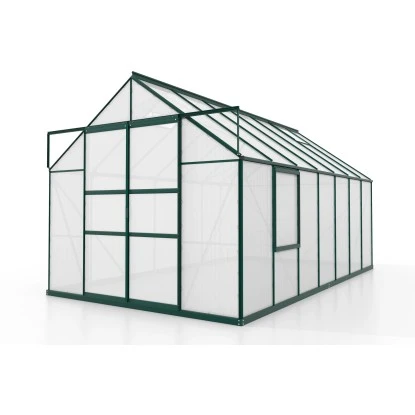 Die Scheiben, ob aus Polycarbonat oder Sicherheitsglas, werden im Gewächshausrahmen mit den bewährten Federklammern verankert. Während die Hohlkammerplatten an einem Stück zwischen den Profilen befestigt werden, wird das Glas überlappend montiert (Klinkerverglasung). Jedes Modell ist serienmäßig mit einem Seitenfenster, zwei Dachfenstern und Regenrinnen ausgestattet. Das Gewächshausset beinhaltet passendes Zubehör.