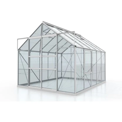 Die Scheiben, ob aus Polycarbonat oder Sicherheitsglas, werden im Gewächshausrahmen mit den bewährten Federklammern verankert. Während die Hohlkammerplatten an einem Stück zwischen den Profilen befestigt werden, wird das Glas überlappend montiert (Klinkerverglasung). Jedes Modell ist serienmäßig mit einem Seitenfenster, zwei Dachfenstern und Regenrinnen ausgestattet. Das Gewächshausset beinhaltet passendes Zubehör.