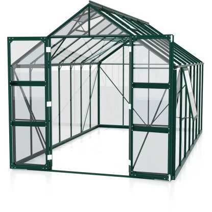 Das Gewächshaus Olymp ist in vier verschiedenen Größen mit Grundflächen von 6,7 bis 11,5 Quadratmetern und in drei verschiedenen Farben erhältlich.