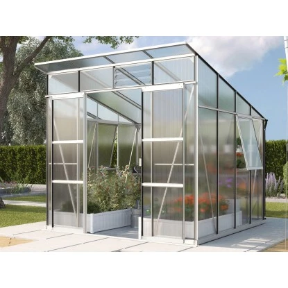 Das Gewächshaus verfügt über einen komfortablen Zugang durch eine breite Doppelschiebetür. Die bodentiefe Türschwelle erleichtert das Eintreten in das Gewächshaus, auch mit Gartenwerkzeugen. Dank des Pultdaches können Sie im Inneren des Gewächshauses aufrecht stehen und angenehm an Ihren Pflanen arbeiten. Falls Sie das Haus abschließen möchten, können Sie dies problemlos tun, da sich an der Tür eine Vorrichtung für ein Vorhängeschloss (separat erhältlich) befindet. Zur verbesserten Belüftung des Gartenhauses, verfügt dieses über ein aufstellbares Seitenfenster.