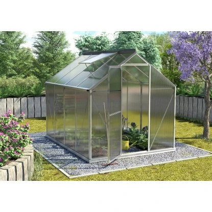 Die Montagetechnik wurde verändert und deutlich verbessert, sodass die Rahmen aus Aluminium einfach und bequem mit 4 oder 6 mm Hohlkammerplatten aus Polycarbonat (PC), aber auch mit kristallklarem Sicherheitsglas (ESG) bestückt werden können. Die Dachfensterverglasung hat bei Hohlkammerplatten-Modellen immer eine Stärke von 4 mm. Das Gewächshaus hat eine neuartige und sehr einfache Einschubtechnik, bei der die Scheiben auf ganzer Länge von abgeflachten Designprofilen eingefasst bzw. umrahmt werden. Daher zeichnet es sich auch ohne zusätzliche Windsicherungssysteme durch hohe Windstabilität aus. Die milchige Oberfläche der Hohlkammerplatten bricht das Licht, sodass meist kein Abschattieren notwendig ist. Die Glasmodelle hingegen bestechen durch ihre klassische Optik. Es ist in fünf verschiedenen Größen mit den Grundflächen von 2,6 bis 7,5 m² und in drei Farben erhältlich: In Aluminium eloxiert sowie in Smaragd und in Schwarz pulverbeschichtet. Das Triton wird inklusive Stahlfundament geliefert. Je nach Modell ist das Triton mit einem oder mit zwei Dachfenstern ausgestattet, die eine gute Be- und Entlüftung garantieren. Die Regenrinnen gehören auch zur Standardausstattung. Die Tür kann wahlweise als praktische Schiebe- oder Schwingtür montiert werden. Sie hat eine Breite von 60 cm und eine Höhe von 164 Gewächshausset beinhaltet passendes Zubehör.
