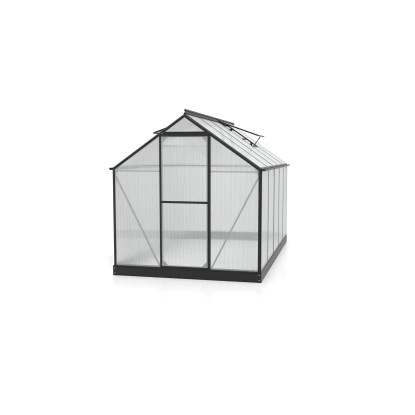 Die Montagetechnik wurde verändert und deutlich verbessert, sodass die Rahmen aus Aluminium einfach und bequem mit 4 oder 6 mm Hohlkammerplatten aus Polycarbonat (PC), aber auch mit kristallklarem Sicherheitsglas (ESG) bestückt werden können. Die Dachfensterverglasung hat bei Hohlkammerplatten-Modellen immer eine Stärke von 4 mm. Das Gewächshaus hat eine neuartige und sehr einfache Einschubtechnik, bei der die Scheiben auf ganzer Länge von abgeflachten Designprofilen eingefasst bzw. umrahmt werden. Daher zeichnet es sich auch ohne zusätzliche Windsicherungssysteme durch hohe Windstabilität aus. Die milchige Oberfläche der Hohlkammerplatten bricht das Licht, sodass meist kein Abschattieren notwendig ist. Die Glasmodelle hingegen bestechen durch ihre klassische Optik. Es ist in fünf verschiedenen Größen mit den Grundflächen von 2,6 bis 7,5 m² und in drei Farben erhältlich: In Aluminium eloxiert sowie in Smaragd und in Schwarz pulverbeschichtet. Das Triton wird inklusive Stahlfundament geliefert. Je nach Modell ist das Triton mit einem oder mit zwei Dachfenstern ausgestattet, die eine gute Be- und Entlüftung garantieren. Die Regenrinnen gehören auch zur Standardausstattung. Die Tür kann wahlweise als praktische Schiebe- oder Schwingtür montiert werden. Sie hat eine Breite von 60 cm und eine Höhe von 164 Gewächshausset beinhaltet passendes Zubehör.