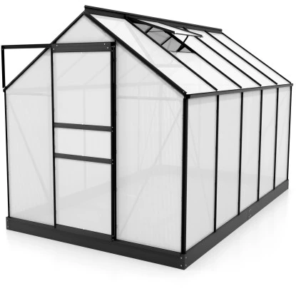 Das Modell Venus hat eine leichtgängige, kugelgelagerte Schiebetür mit einer Breite von 61 cm und einer Höhe von 161 cm. Je nach Modell ist es serienmäßig mit ein oder zwei Dachfenstern ausgestattet. Auch die Regenrinnen gehören zur Standardausstattung. Für den ebenerdigen und rechtwinkligen Aufbau des Gewächshauses ist ein Fundamentrahmen im Lieferumfang enthalten. Das Gewächshausset beinhaltet passendes Zubehör.